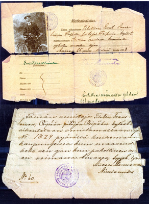 Kuva 4. Pöytyän nimismies Anders Mennander myönsi Frans Evert Saarelaiselle kuvalla varustetun polkupyörän ajoluvan 25.7.1918 Aurassa ja lupa oli voimassa vuoden ajan Suomen muissa kunnissa. Lupa oli pyöräkohtainen ja se tuli pitää mukana aina ajon aikana.